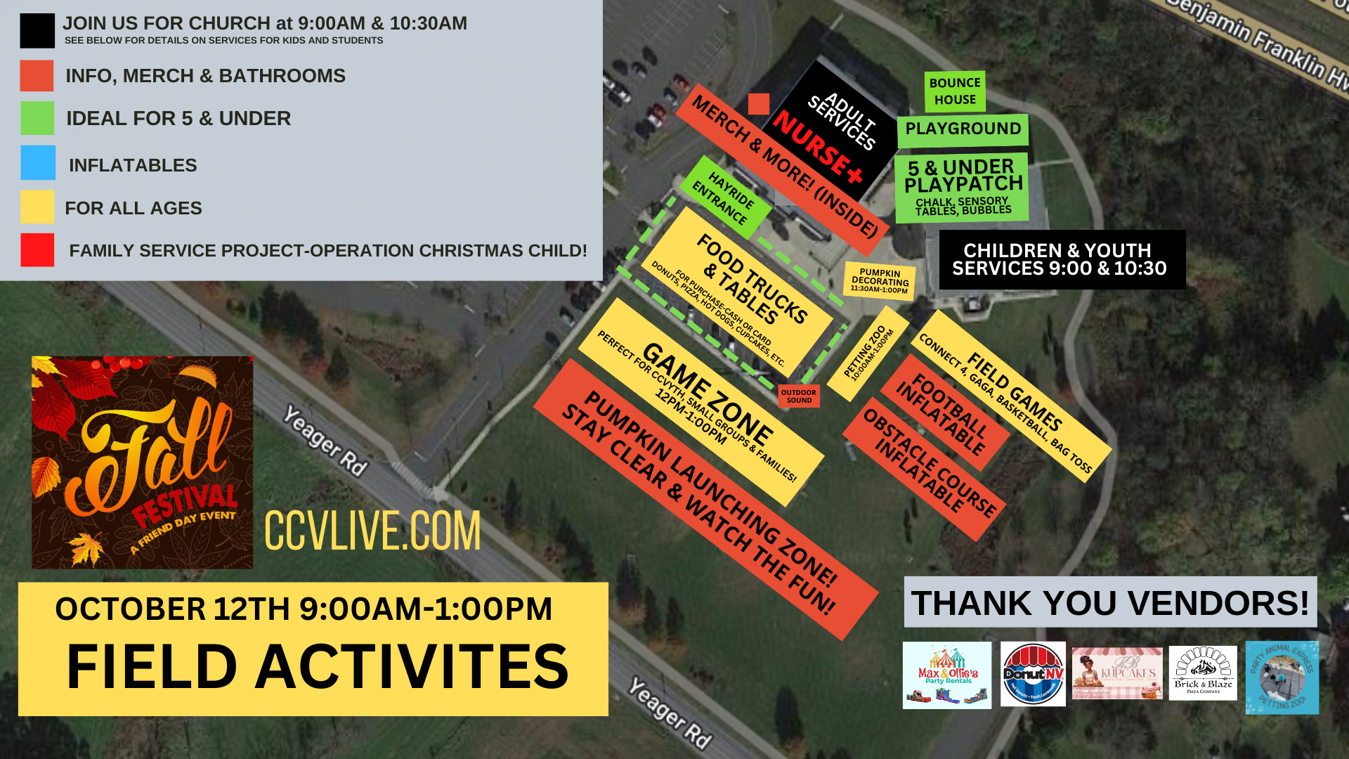 On Sunday, October 12th, CCV will come alive with hay rides, food trucks, apple cider, hot dogs, a chili cook-off, inflatables, and more. It’s a day for families to laugh, connect, and feel welcomed—but it won’t happen without you. Volunteering helps create moments where guests feel loved—and that’s often the reason they come back to hear about Jesus. Sign up to volunteer or to be a vendor below. Be sure to invite a friend—we’ll see you there!
