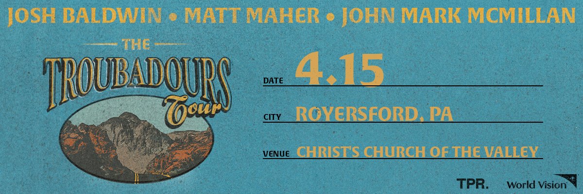 Josh Baldwin, Matt Maher, and John Mark McMillan are bringing "The Troubadours Tour" to CCV on Wednesday, April 15th! Tickets are on sale NOW! Featuring songs that have shaped churches and listeners around the world, alongside moments of storytelling and reflection, you won't want to miss this night of meaningful worship and connection! We hope you can join us!